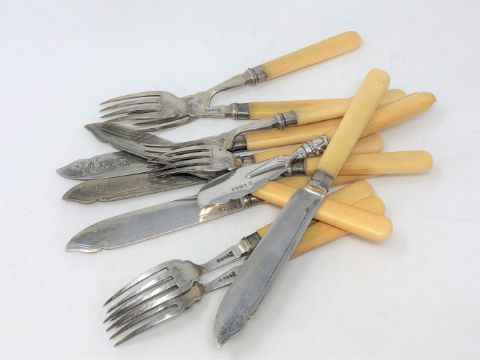 Twelve various pieces of EPNS fish cutlery with silver ferrules. (12)