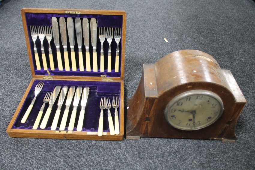 A walnut cased Art Deco mantel clock (a/f), together with an Edwardian oak canteen of fish cutlery