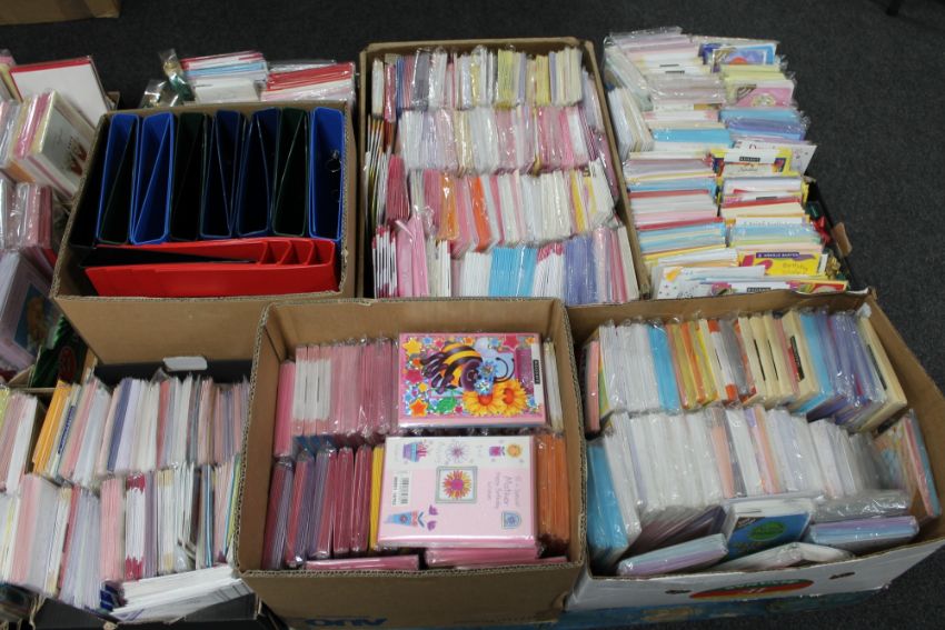 A pallet of seven boxes of assorted greetings cards together with a box A4 files