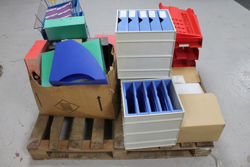 A pallet of office supplies : file boxes, envelopes, desk tidy's etc