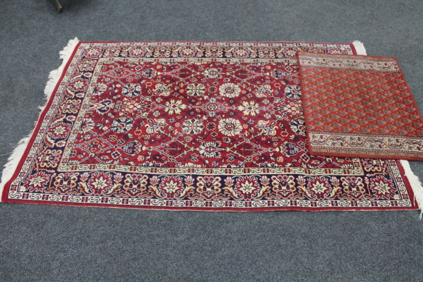 A fringed floral rug on red ground together with a further mat