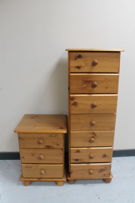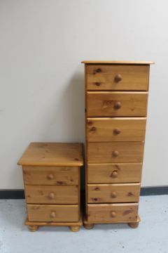 A narrow pine seven drawer chest and a pine bedside chest