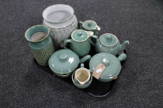 A tray of five pieces of Denby stoneware, two Denby stoneware lidded soup pots, Denby vase and one other vase