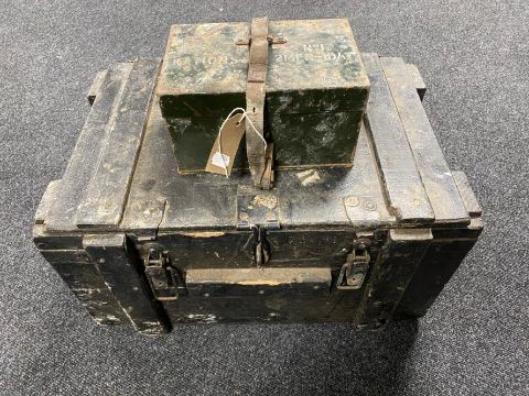 A painted military ammunition crate together with a metal box