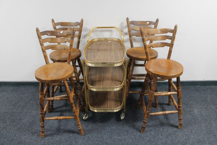 Four elm kitchen bar chairs and a gilt three tier trolley