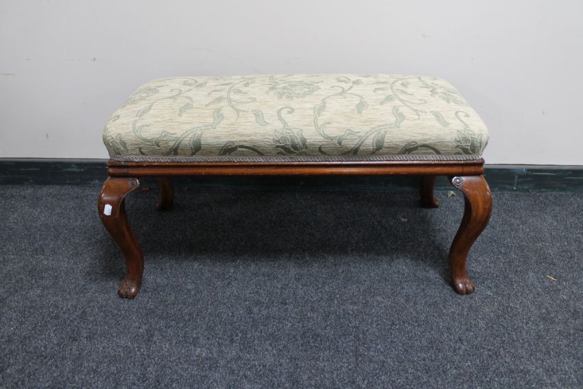 An antique mahogany duet foot stool on paw feet