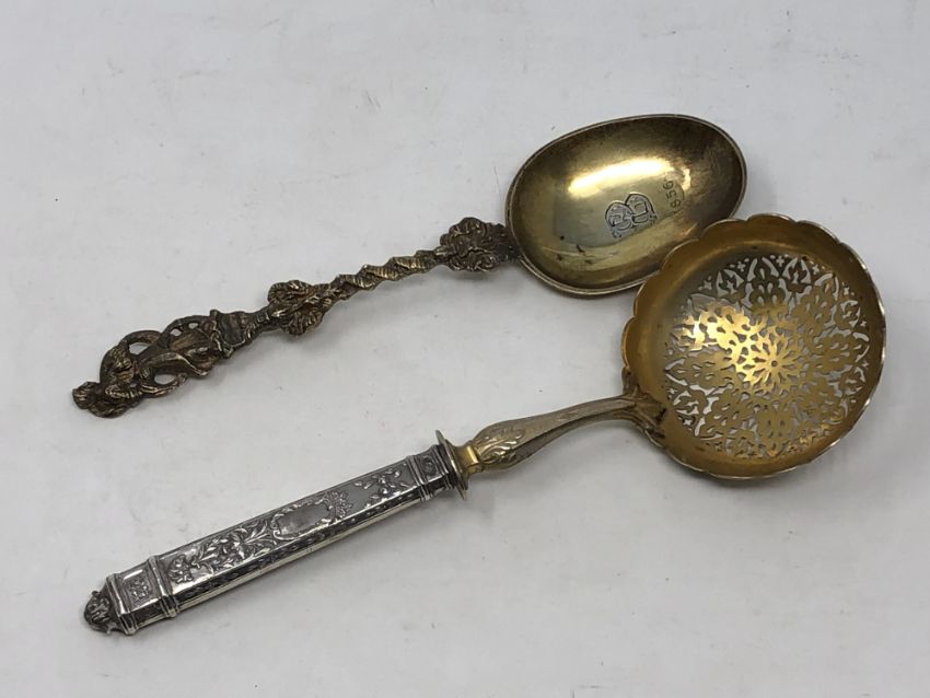 A 19th century silver strainer and a mid-Victorian silver gilt spoon dated 1856 (2)