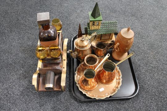 A tray of assorted metal ware to include copper measures on tray, eastern copper tea pot, musical mantel clock, decanter and glass set on stand in the form of a vintage motorcar