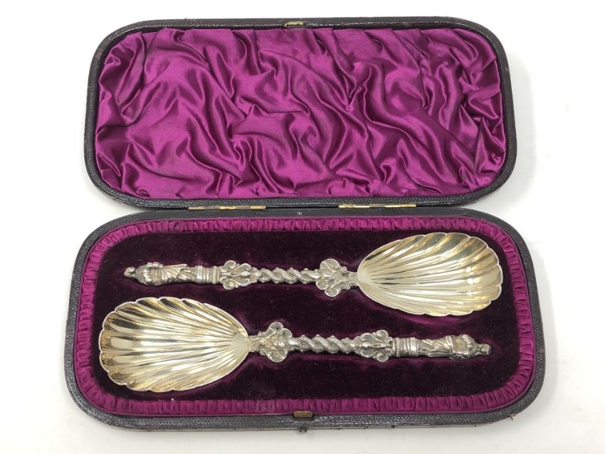 A good pair of cased Victorian silver gilt apostle spoons, Charles Boyton, London 1884