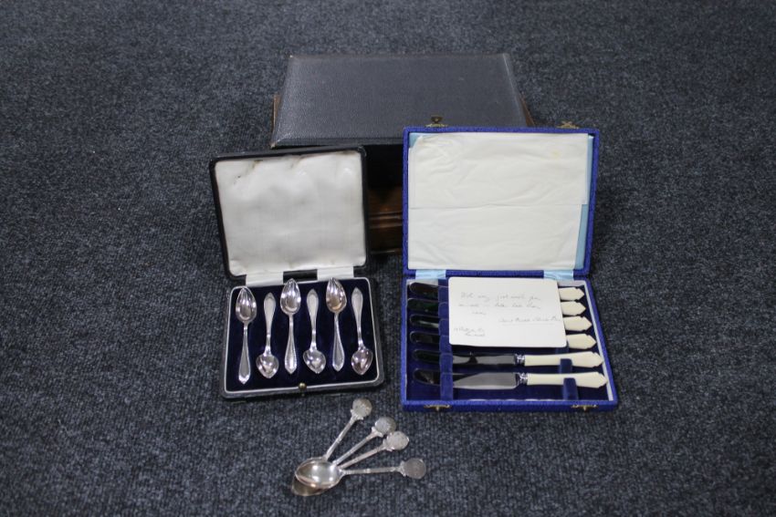 A collection of silver plated cutlery, four silver teaspoons, cased part canteens etc