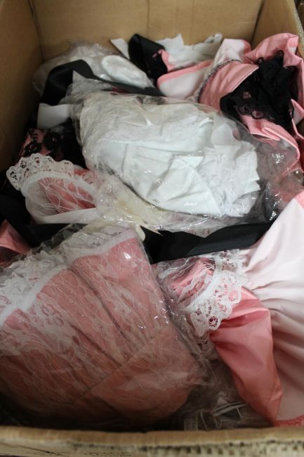 A box of phaze serana hitch up dress, candy tie micro mini skirt etc
