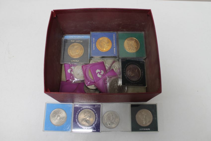 A box of commemorative crowns and bronze coins