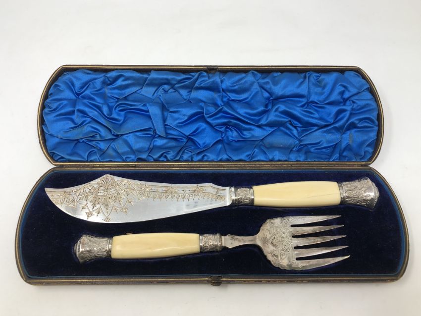 A fine boxed pair of Victorian silver and ivory fish servers, Sheffield 1879.