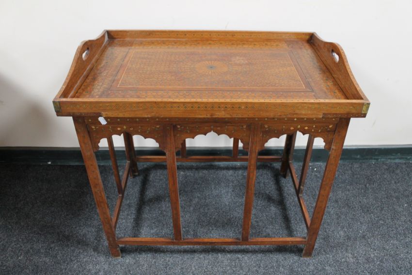 A folding Eastern table with brass inlaid and lift off gallery tray