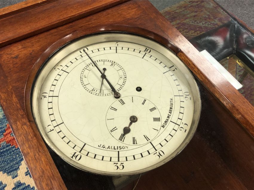 A 19th century mahogany cased regulator wall timepiece, signed J.G. Allison, Monkwearmouth, the rectangular case with ogee pediment, side door, painted 12" dial with Arabic outer minutes and subsidiary seconds, Roman subsidiary hours, single weight driven movement with deadbeat escapement, with cylindrical zinc bob, weight and key, height 145cm.