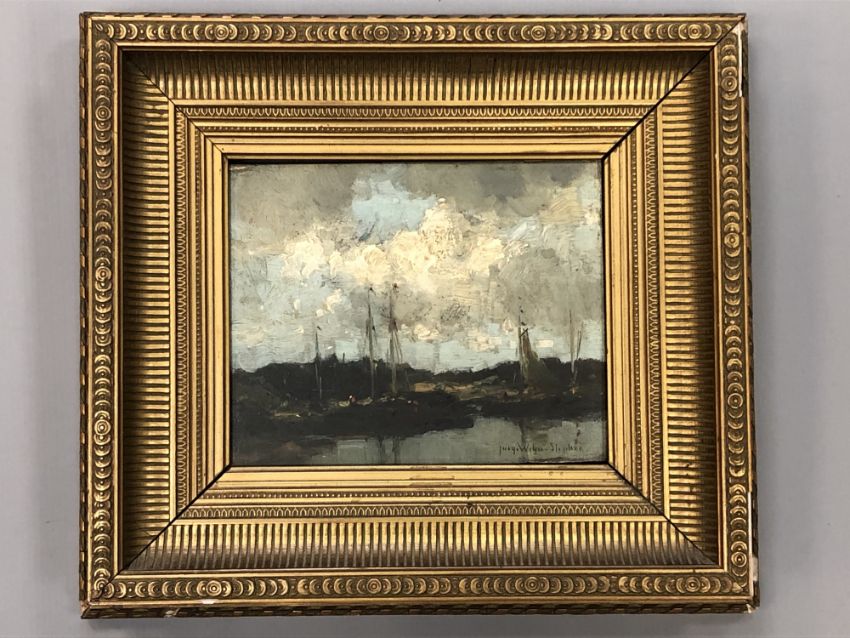 Jacques Stephen Witjens (1881-1956) Dutch : Boats in a harbour at sunset, oil on panel, signed, 20 cm x 17 cm, framed.