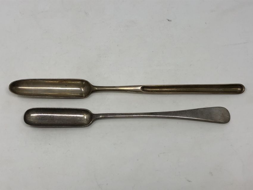A Georgian silver marrow scoop, maker Thomas Oliphant, with crest, together with another silver marrow scoop (2)