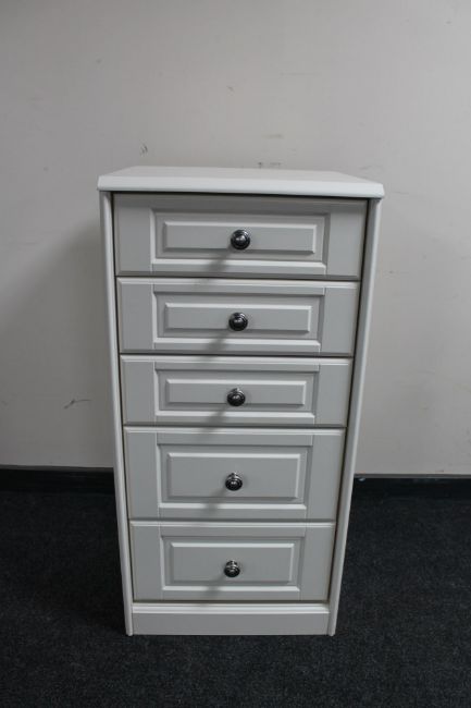A white narrow five drawer chest
