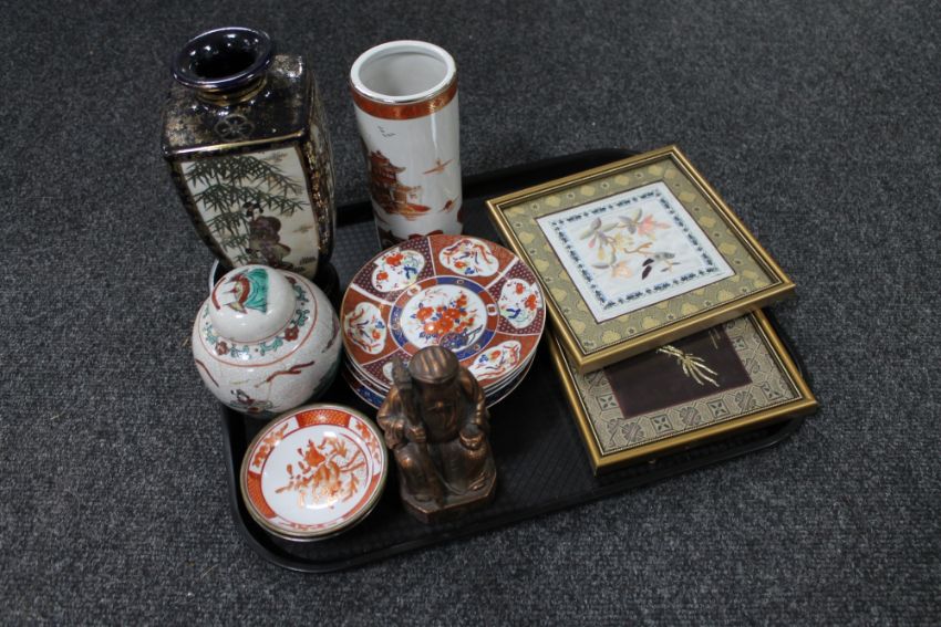 A pair of Chinese silk work plaques, Japanese gilded vase, oriental wares etc