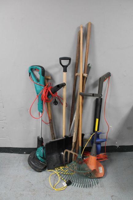 A plastic tub containing gardening tools, two electric strimmers, hedge trimmer and disability walking aid