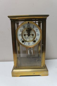 A brass and glass cased anniversary clock with brass and enamelled dial, mercury pendulum and key