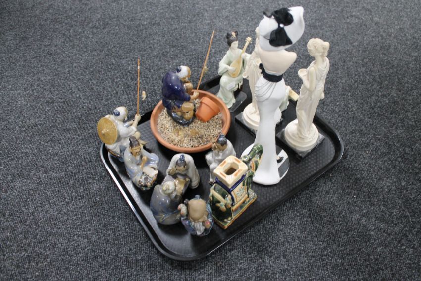 A tray of Chinese figures, contemporary Grecian style figures etc