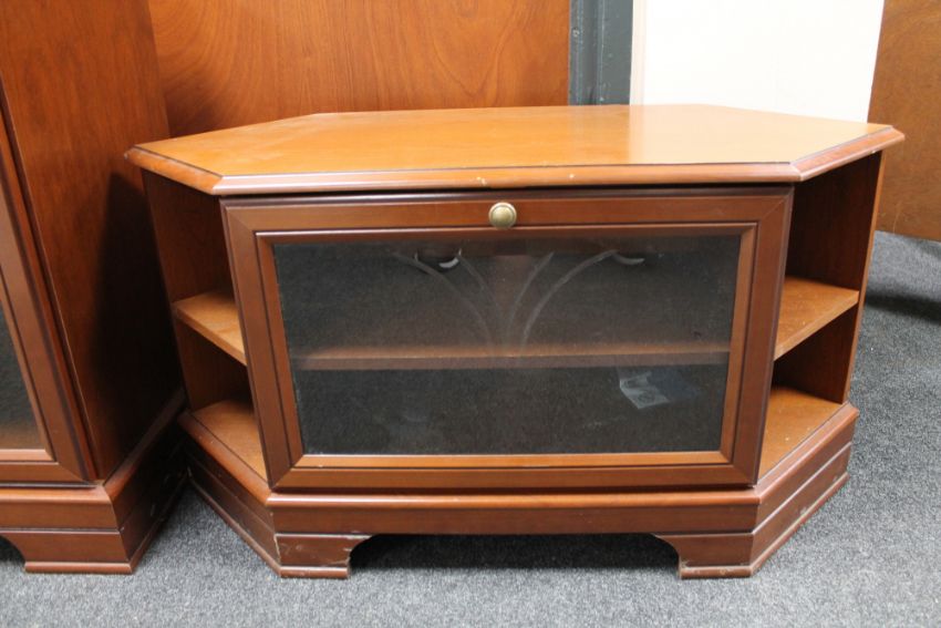 A contemporary corner TV stand with matching audio cabinet