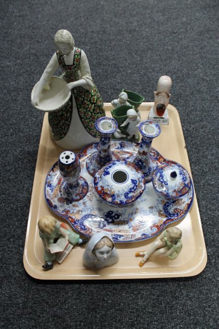A tray of antique and later china, six piece dressing table set, continental figurines etc