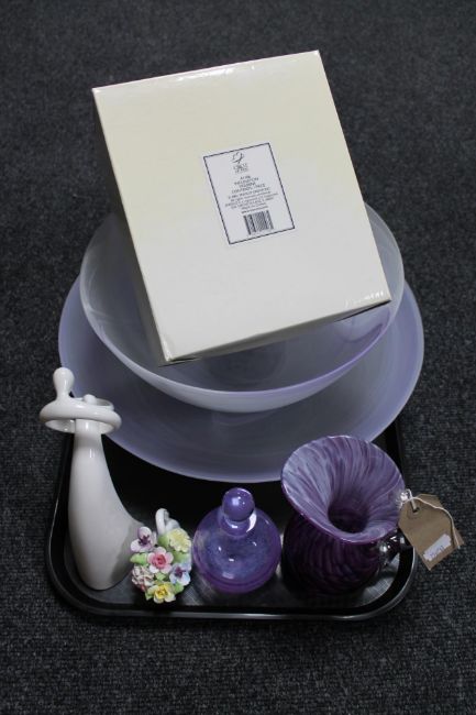 A tray of Alum Bay purple glass jug, Caithness perfume bottle, Portmeirion glass dish, boxed circle of Love figure, Royal Doulton china flower posy