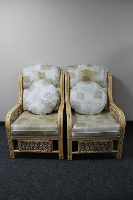 A pair of bamboo and wicker conservatory chairs with cushions