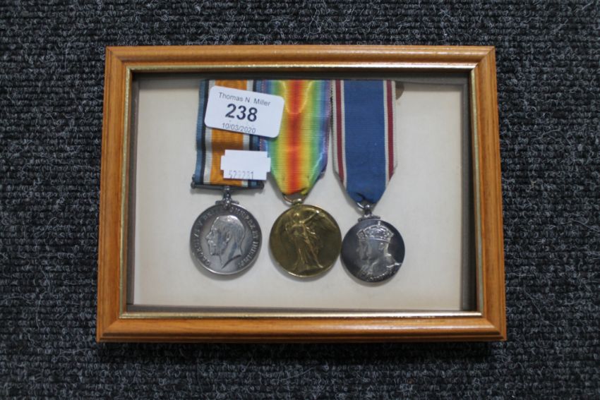 A group of war medals - two WWI awarded to 7884 A. Cpl. G. Million. R.E. and one 1937 commemorative medal on ribbon, mounted on board, framed.