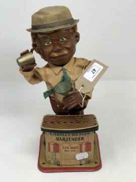 A battery-powered mechanical tin plate toy : CHARLEY WEAVER BARTENDER - ELSI KRACK WAS HERE, height 30 cm.