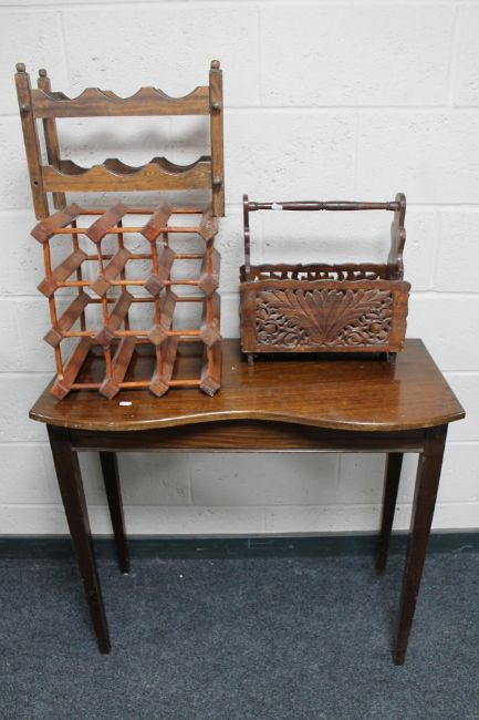 A mahogany shaped front hall table, a magazine rack and two wine racks