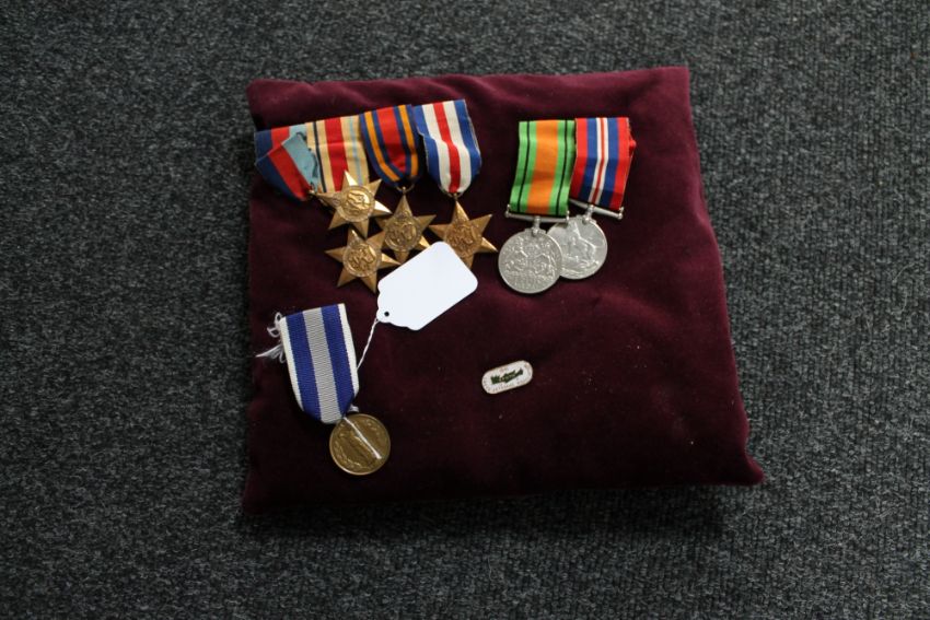 A WWII medal group comprising Africa, Burma, France and Germany, 1939-45 Stars, Defence Medal, and War Medal, unnamed as issued, together with a Greek medal and a Crete Veterans Association enamel badge. (8)