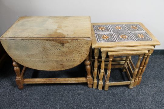 A nest of three blonde oak tiled top tables and a drop leaf coffee table