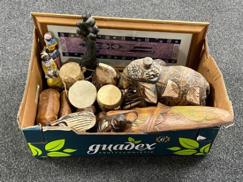 A box of tribal figures, wall masks, miniature hand drum, three pine framed tribal pictures
