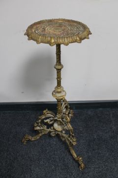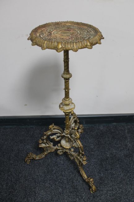 An antique metal tripod plant stand