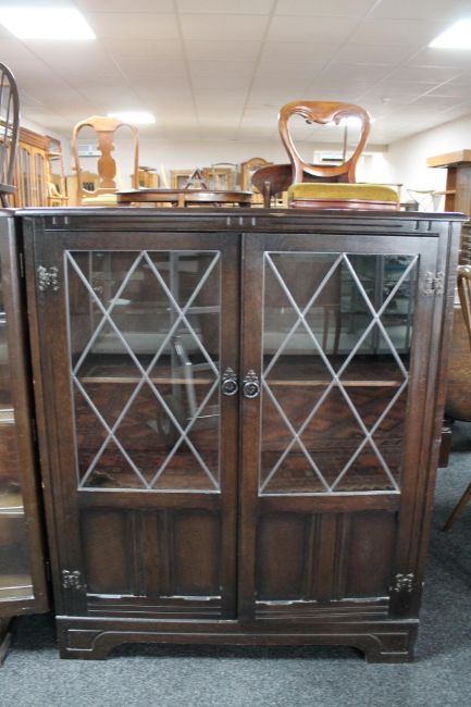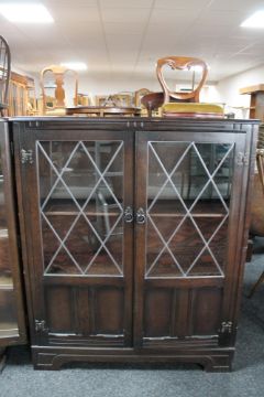 An oak double door bookcase with leaded glass doors