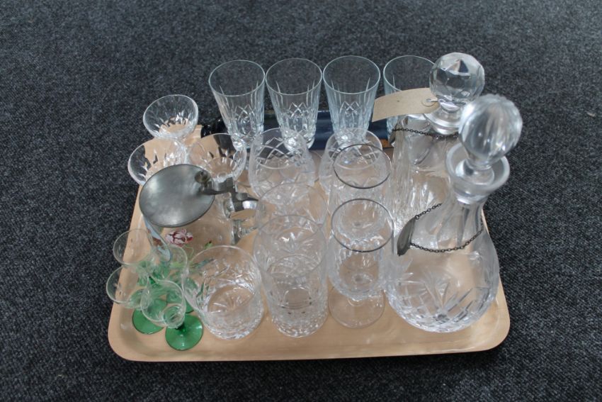 A tray of glass ware - antique blue glass, antique rolling pin, two decanters with labels, drinking glasses