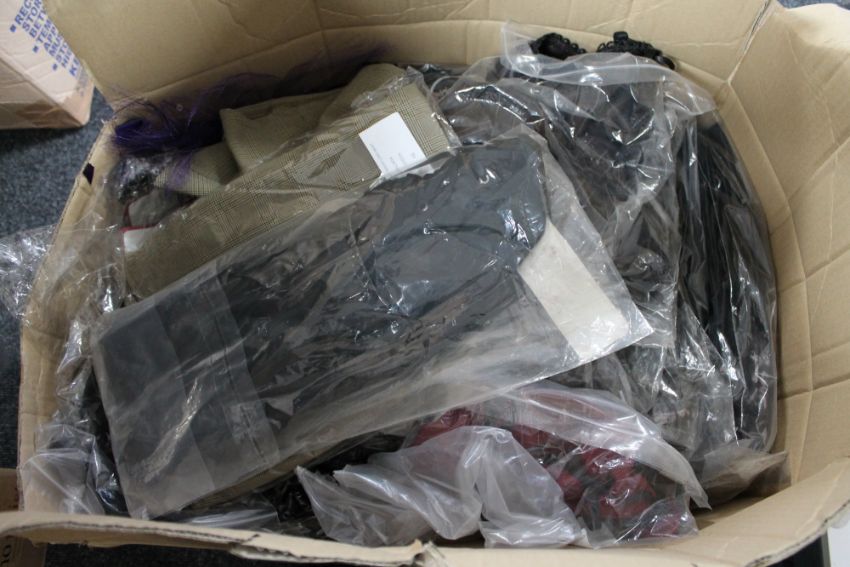 A box of Phaze gloss combat skirts, leopard print mini skirt