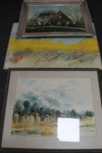 A framed S. Denham oil on board, country house, plus two other framed pictures