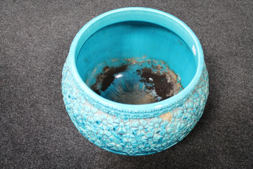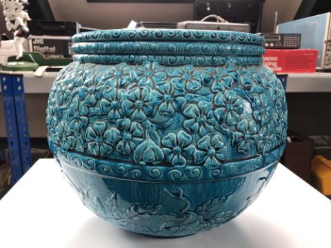 34cm diameter. Crazed all over. Several minor surface flakes/chips, some to the raised detail of the body and several around the rim. Fundamentally in good condition with no cracks or major chips.