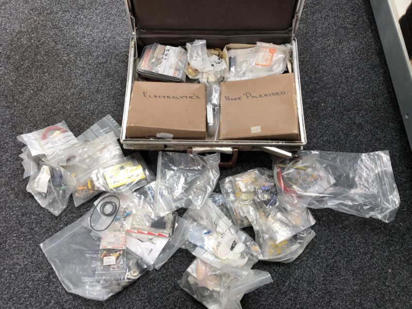 Four boxes of radio parts, soldering irons, spools of cable, etc