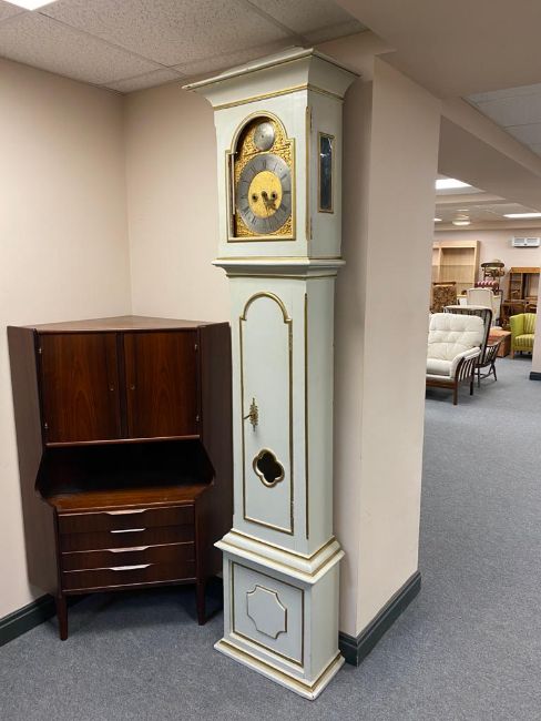 Height 221cm. There is no key and the clock has not been tested. The movement appears relatively clean. There is no glass panel in the hood. See additional images.