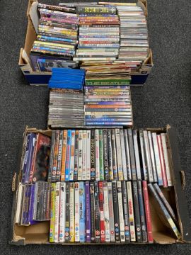 Three boxes of CD's, DVD's and 7 inch singles including The Beatles