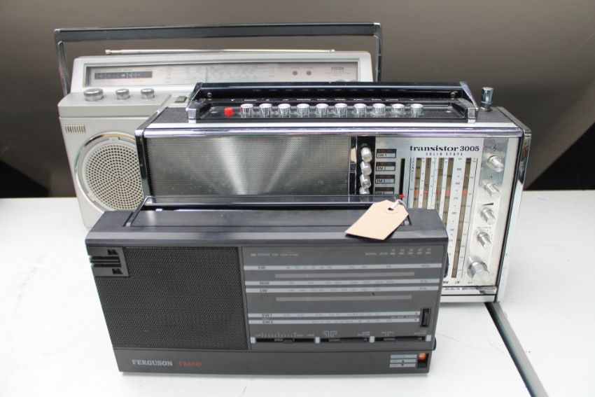 A Grundig solid state transistor 3005 radio, a Sony cassette recorder CFS-47L and a Ferguson five band radio