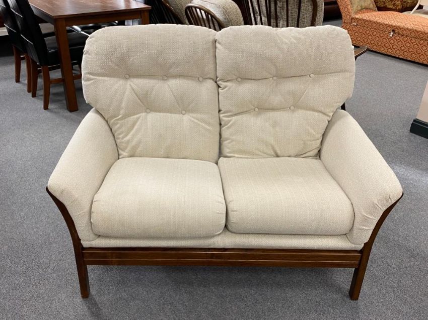 A late 20th century wood framed two seater settee in beige fabric