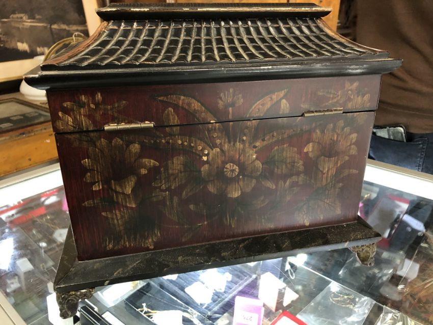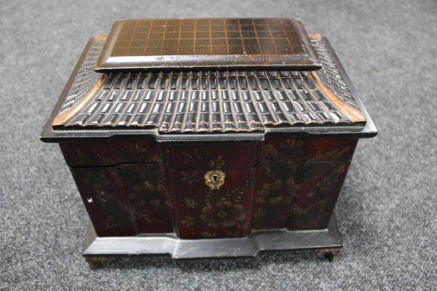 A hand painted jewellery casket in the form of a Chinese pagoda