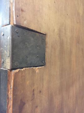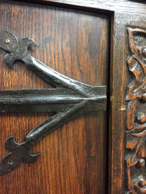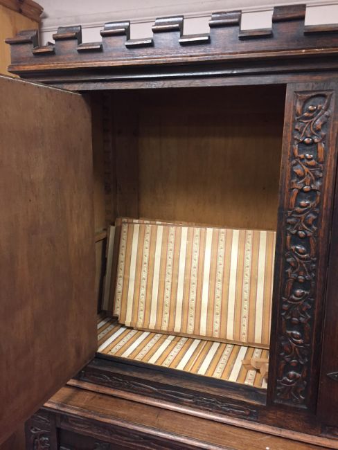 56.5 cm deep at the base and 46 cm deep at the top. Height 183.5 cm. In good general condition. Some minor surface knocks otherwise structurally strong. The doors are a little 'clunky' as the metal iron work doesn't allow a smooth door swing on all doors. Internally there are removable shelves. There is no base panel in the bottom.