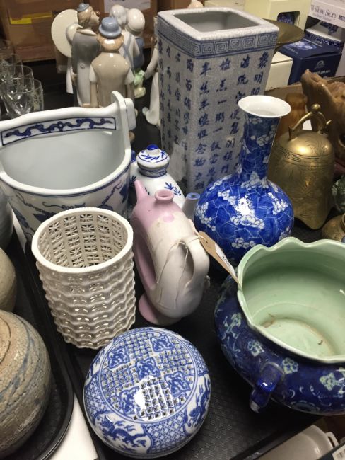 A tray of Oriental style vases, china basket, teapot etc